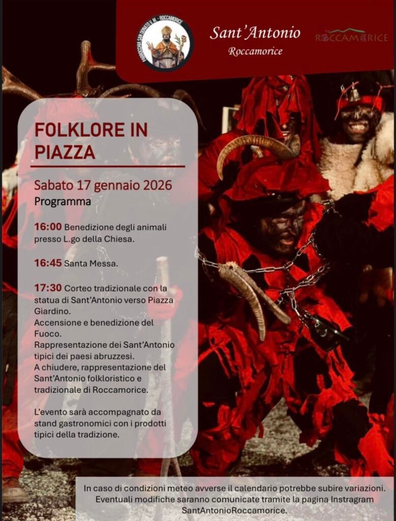 In the small mountain town of Roccamorice, the Feast comes alive with performances depicting scenes from Sant’Antonio’s life. In the evenings leading up to January 17, young locals roam the streets dressed as Sant’Antonio, the devil, and other traditional figures, singing and acting out scenes. On the Feast day, they take the stage in the town’s main piazza. For more see Roccheggiando Roccamorice per immagini page.